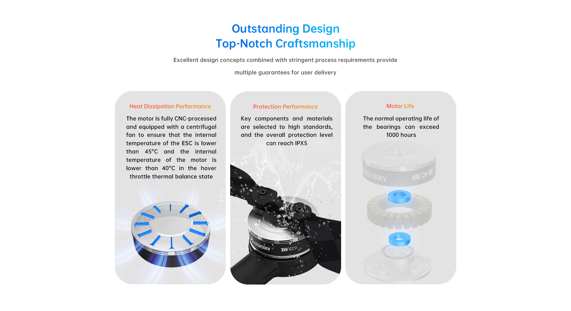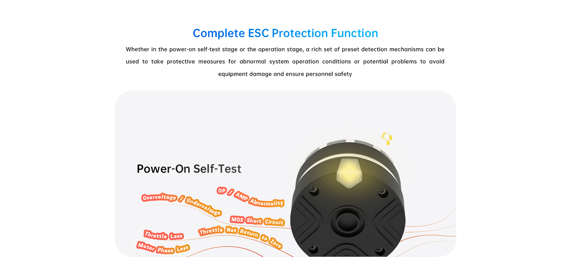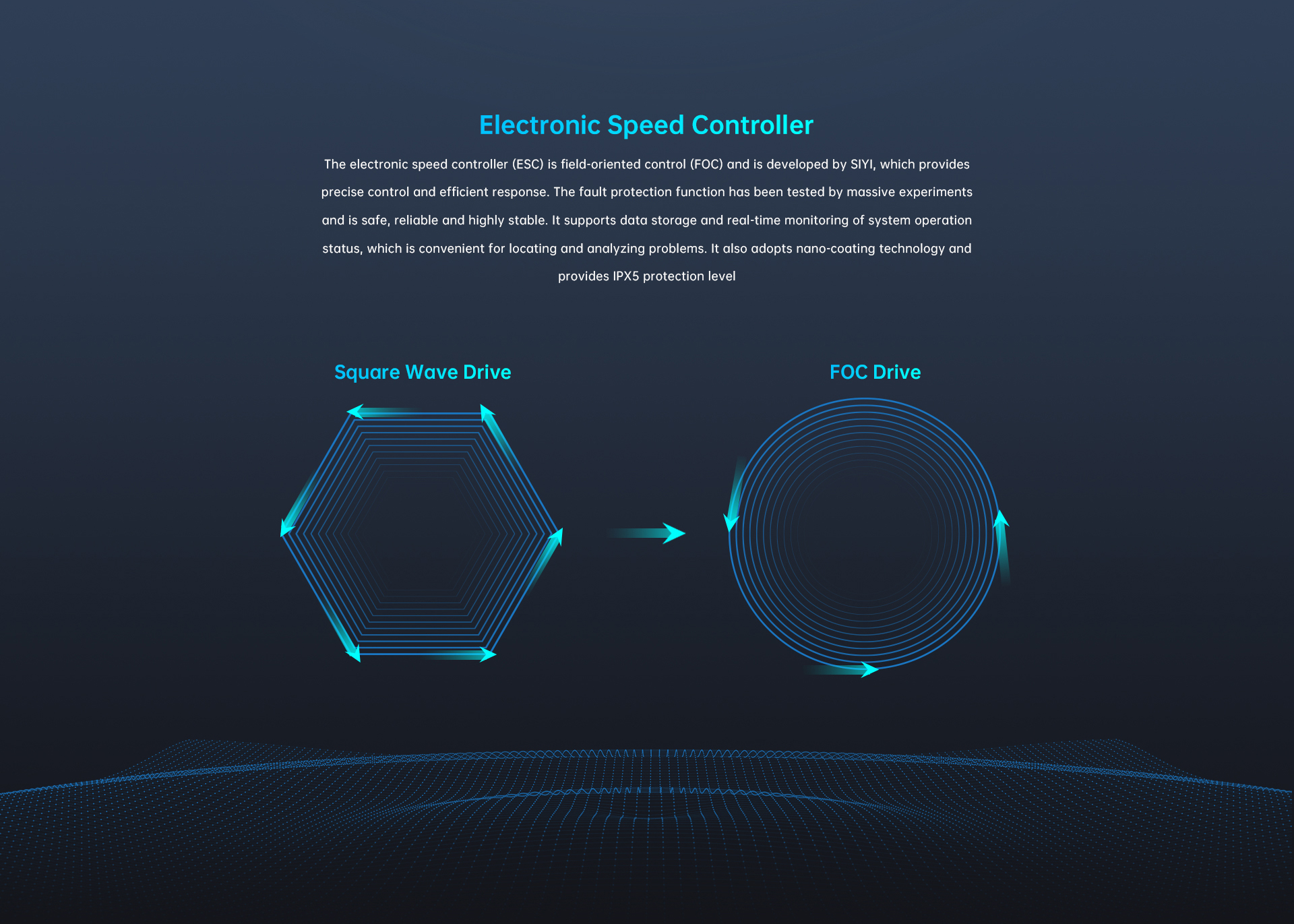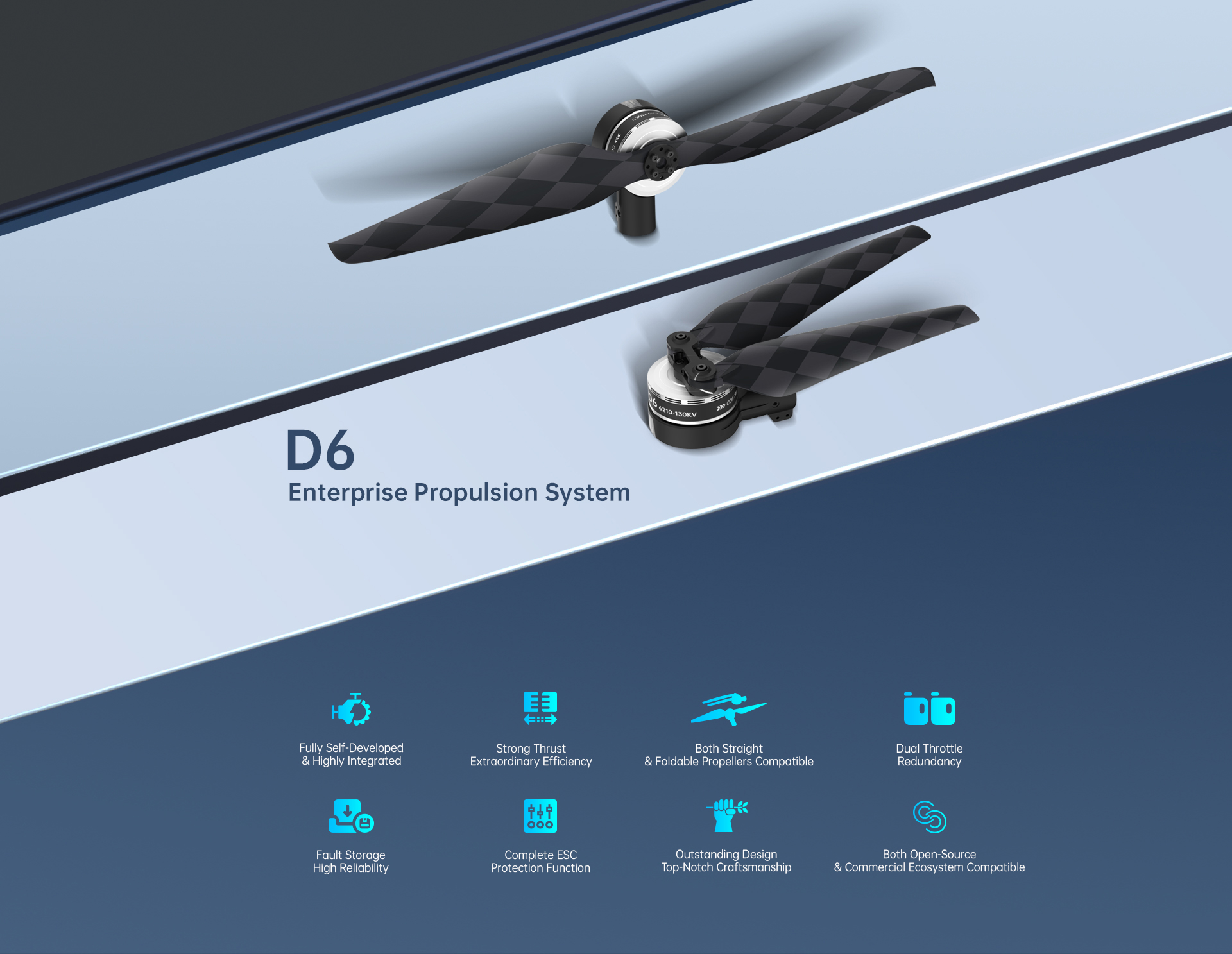 ● Fully Self-Developed & Highly Integrated ● Strong Thrust Extraordinary Efficiency ● Both Straight & Foldable Propellers Compatible ● Dual Throttle Redundancy ● Fault Storage High Reliability ● Complete ESC Protection Function ● Outstanding Design Top-Notch Craftsmanship ● Both Open-Source & Commercial Ecosystem Compatible
