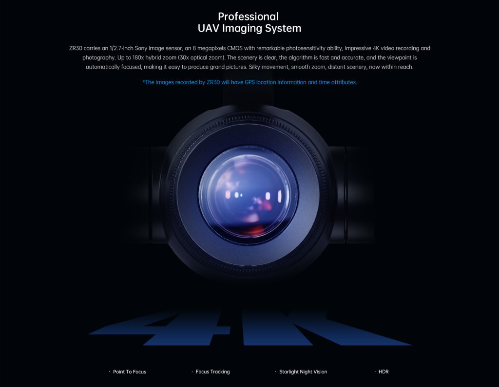 ●ZR30 caries an 1/2.7-inch Sony image sensor, an 8 megopixels CMos with remarkable photosensilivity abity, impressive 4k video recording and photography.