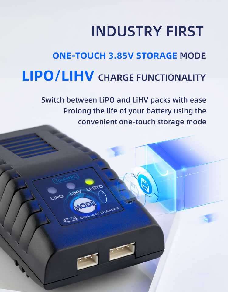 ● Industry first one-touch 3.85V storage modeLIPO/LIHV charge functionality;