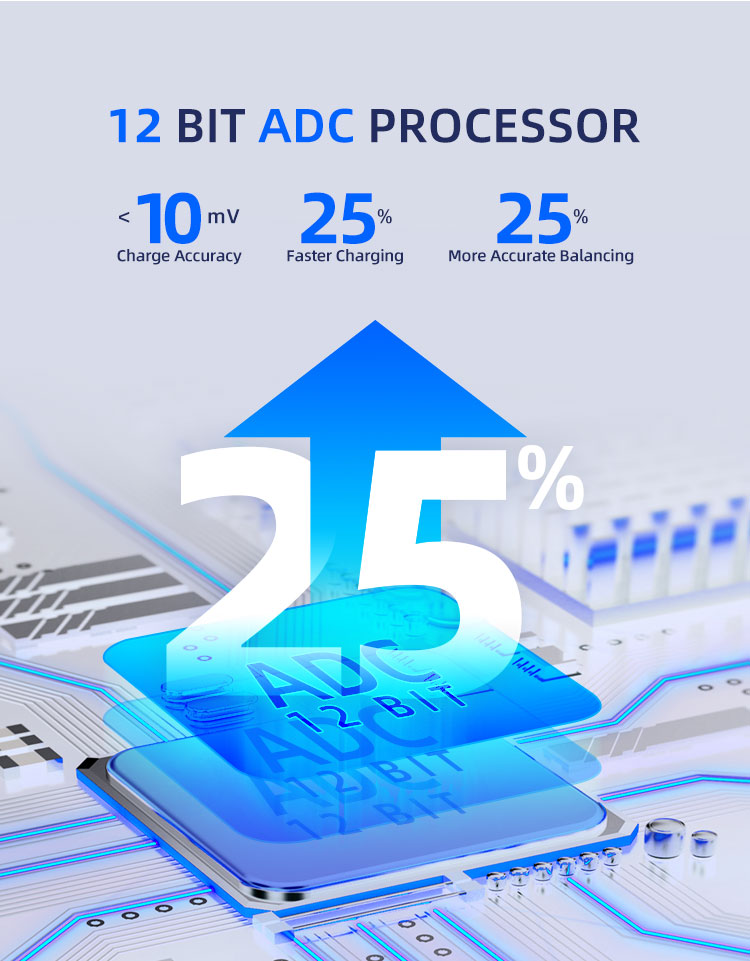 ● 12 bit ADC processor: <10mV charge accuracy, 25% faster charging, 25% more accurate balancing;