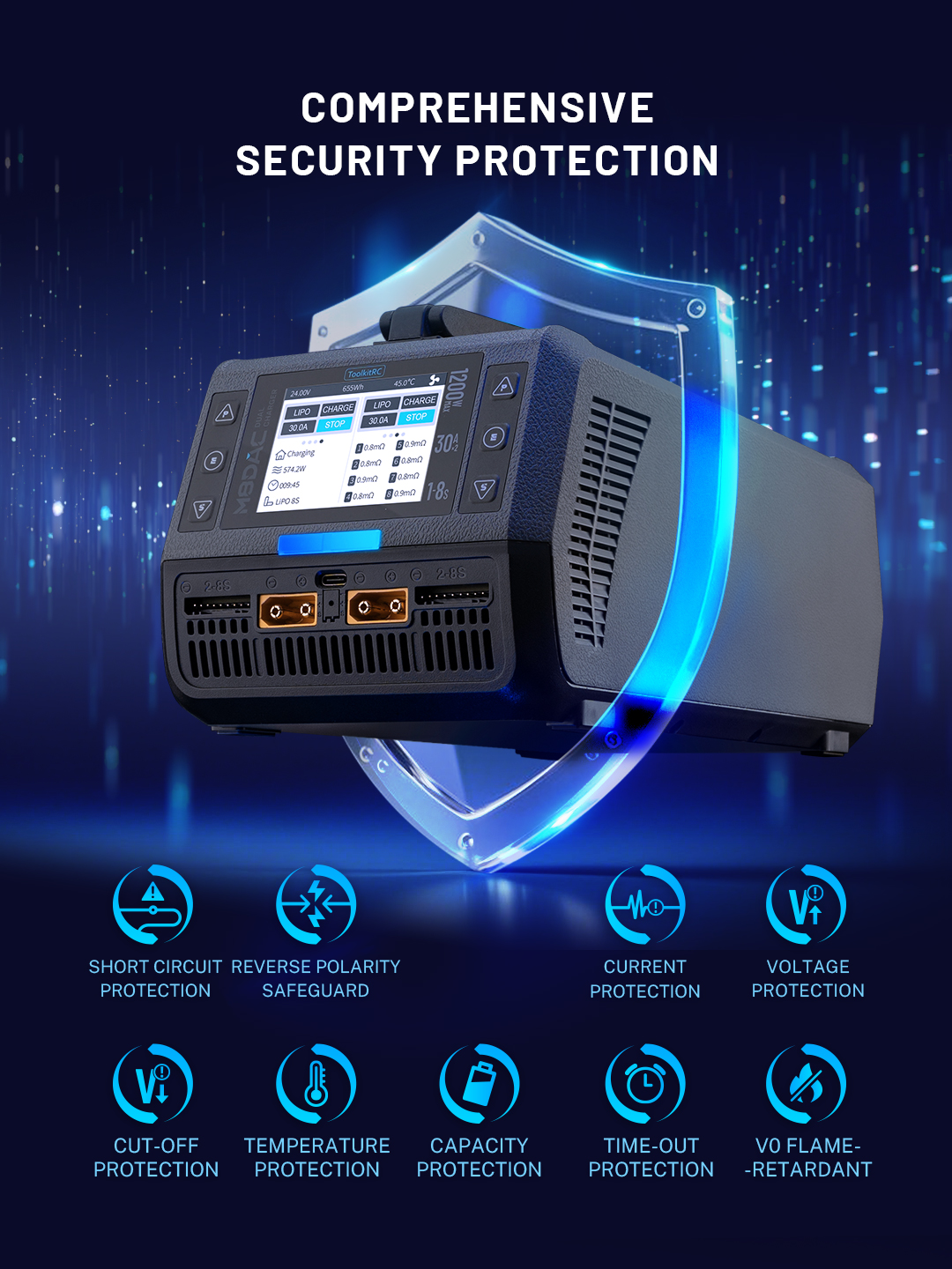 • Comprehensive security protection:Short Circuit Protection / Voltage Protection / Reverse Polarity Safeguard / Current Protection / Capacity Protection / Temperature Protection / Time-Out Protection / Cut-Off Protection / V0 Flame-Retardant.