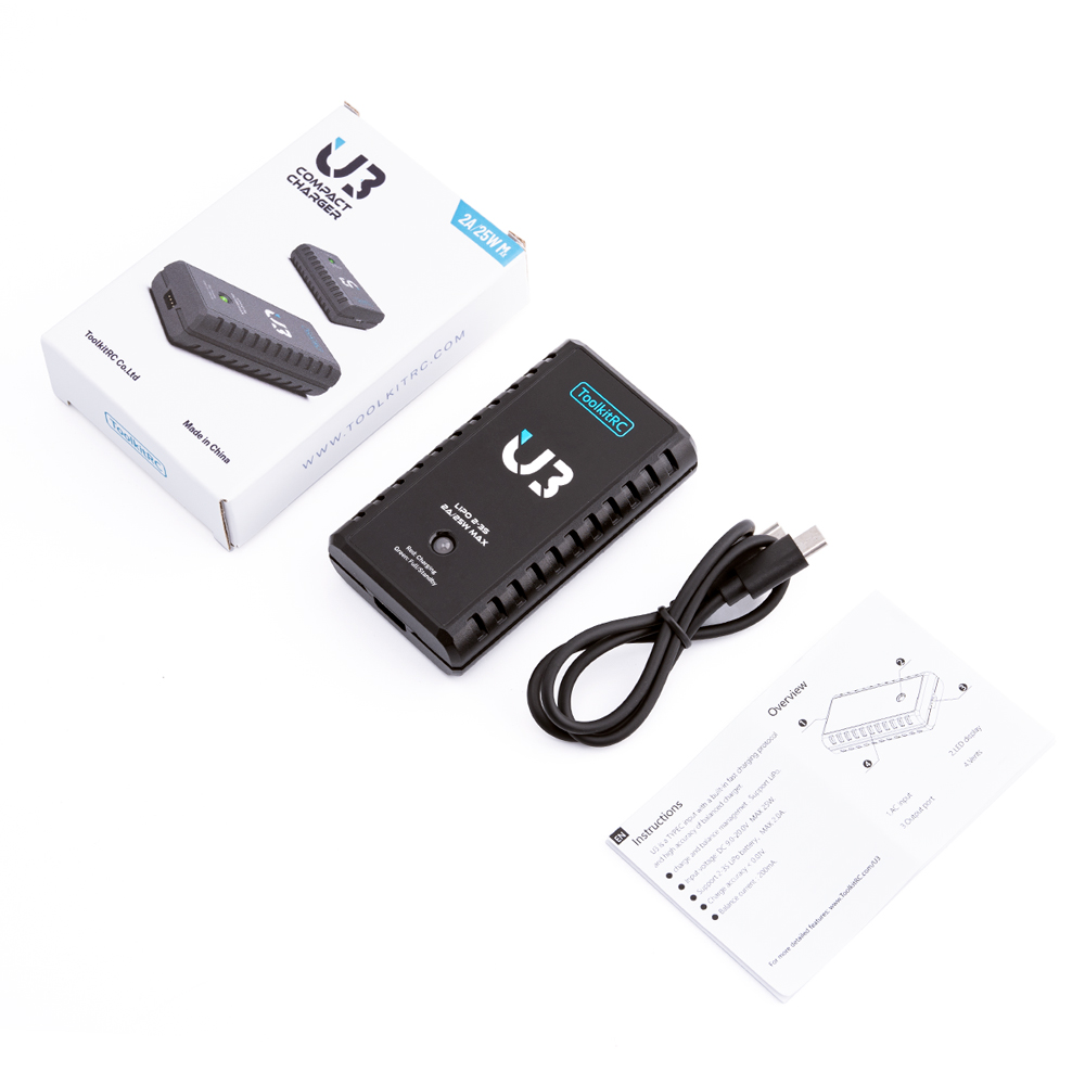 U3 USB-C LiPo Charger × 1, USB-C input Cable × 1, Quick Start Guide × 1