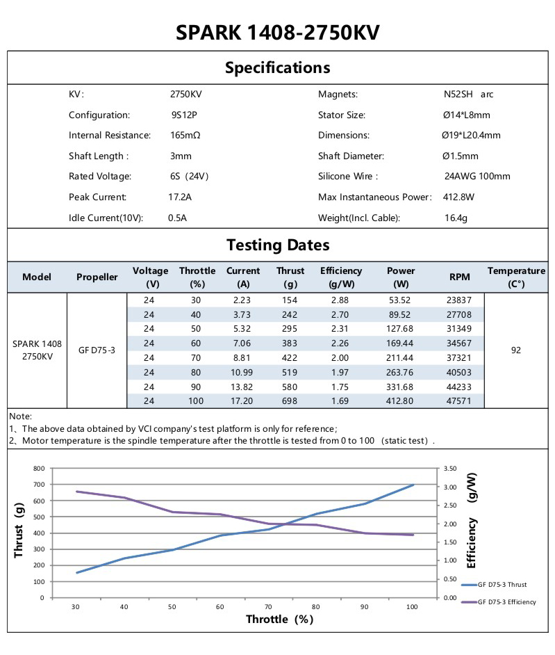 The VCI SPARK1408 motor uses AL7075 high-strength aviation aluminum alloy material. While ensuring the structural strength, it adopts a family-style five-frame lightweight design. The large hollow head cover reduces the mass while enhancing the heat dissipation capacity. Combined with the motor’s own air suction design, the motor temperature is further reduced and the operation is more stable;